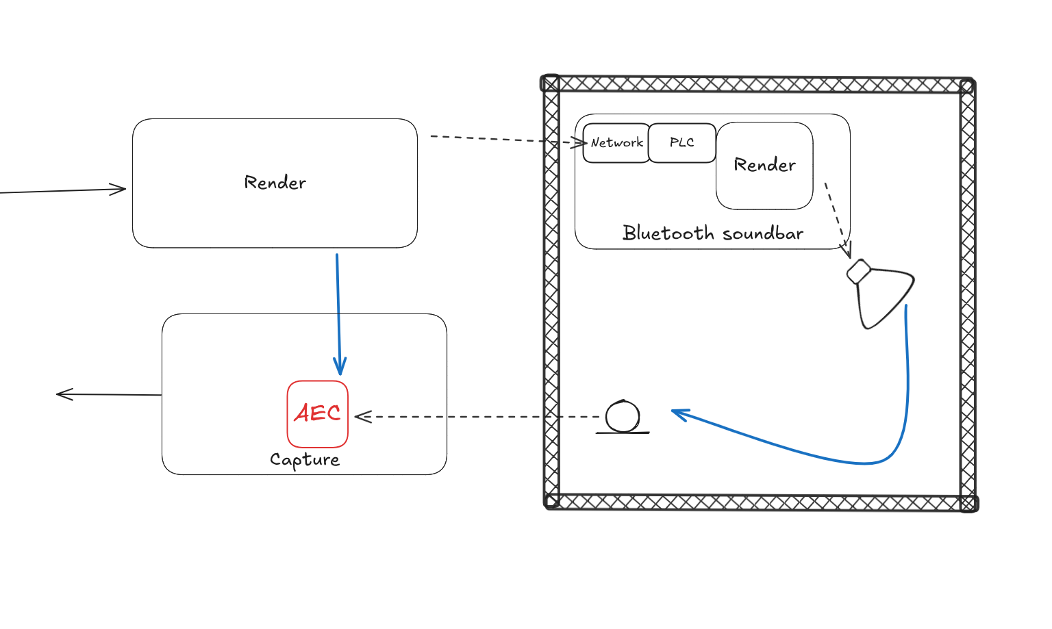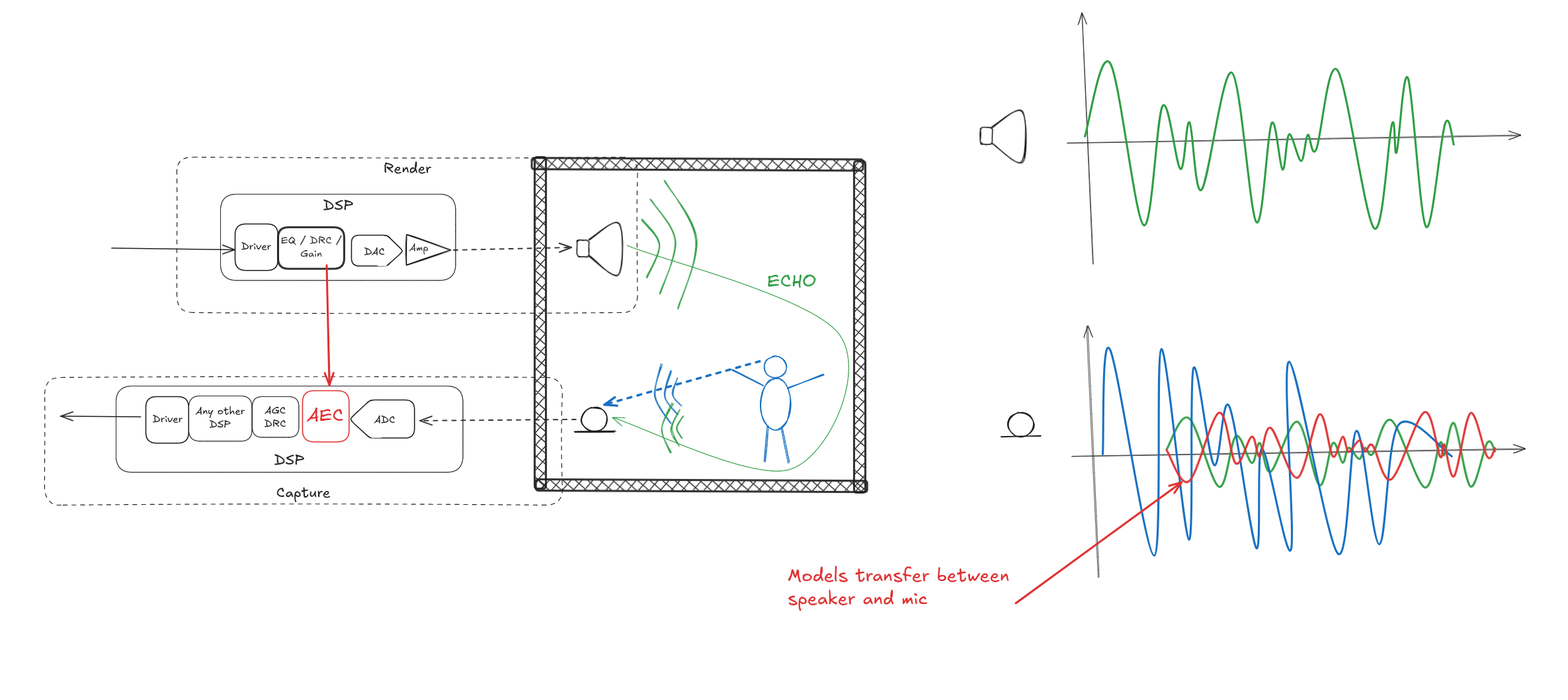 When the path changes, the AEC needs to recalculate the transfer function. This includes accounting for 3p DSP.